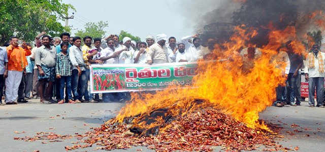 మండే మిరప తెగ పండింది. పండగే అనుకున్నాడు రైతు. కొనే వాడొచ్చాక కానీ,తెలియ లేదు.. మిరప అంటే పంట కాదు… మంట.. అని. అమ్మాలని వస్తే, తెగనమ్మాల్సి వచ్చింది. క్వింటల్కు కనీసం రు.12,000 వస్తాయనుకున్నాడు. మరీ మూడు వేలకు అమ్మమంటే, కడుపు మండి పోయింది. వంటల్లో మండాల్సిన పంట, నిప్పుల్లో మండింది. ఇది ఖమ్మం ఘటన. తెలంగాణ సర్కారుకు కోపం వచ్చింది. రైతు అన్నవాడు తన చేతుల్తో పెంచిన పంటకు తనే ఎందుకు తగలబెట్టుకుంటాడూ… అని లాజిక్కు తీసింది. మార్కెట్టు యార్డులో ఈ ‘పని’ చేసిన వాళ్ళను.. చూస్తే వాళ్ళు రైతుల్లా లేరని అనుమాన పడింది… ఇంకాస్త ముందు కెళ్ళి ప్రతిపక్షాలే ఈ పనులు చేశారని ఆరోపించింది. అరెస్టులు చేసింది. కేసులు పెట్టింది.