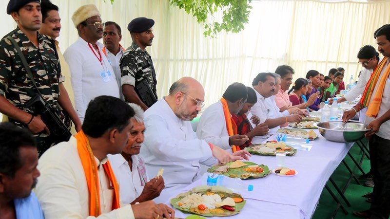 ఇక రెండుగా వేరుపడ్డ తెలుగు రాష్ట్రాలలో కూడా పాగా వెయ్యాలన్న సంకల్పం ఎంత వుందో, మండుటెండల్లో(మే రెండవ పక్షంలో) ఆ పార్టీఅధ్యక్షులు, వ్యూహకర్త అమిత్ షా పర్యటన ద్వారా స్పష్టం చేస్తున్నారు. ముందు తెలంగాణలో చాలా మాట్లాడారు. ఇప్పటికే లక్ష కోట్లిచ్చేసామన్నారు. ఇంకే ముంది 2019 లో తెలంగాణలో కూడా బీజేపీ సర్కారు వచ్చేస్తుందన్నారు. అంతటితో ఆగలేదు. ఒక జనాకర్షక నేతగా ( మోడీకున్నజనాకర్షణ తనకీ వుందని భావించారో, యేమో), చేనేత కార్మికులతో పాటు మగ్గం పట్టారు. దళితుల సరసన కూర్చొని భోజనాలు చేశారు. అయితే ఆ భోజనాలు దళితుల ఇంట వండి, వార్చినవీ కావనీ, ఎక్కడో తోటలోఅగ్రవర్ణాలు స్వహస్తాలతో తయారు చేసినవనీ తర్వాత తెలంగాణ ముఖ్యమంత్రి కేసీఆర్ మీడియా సమావేశం పెట్టి మరీఆరోపించారు. ‘లక్ష కోట్లు’ ఇచ్చింది ఎలా నిజం కాదో చెప్పే పేరు మీద అమిత్ షాకూ, తెలంగాణ బీజేపీ రాష్ట్ర నేతలకూ రేవు పెట్టేశారు. తాను ప్రధాని అవుతానని ప్రకటిస్తే ఎంత జోక్గా తీసుకుంటారో, బీజేపీ తెలంగాణలో సర్కారు ఏర్పాటు చేస్తుందనటాన్ని కూడాజోక్గా తీసుకుంటారని వెక్కిరించారు.