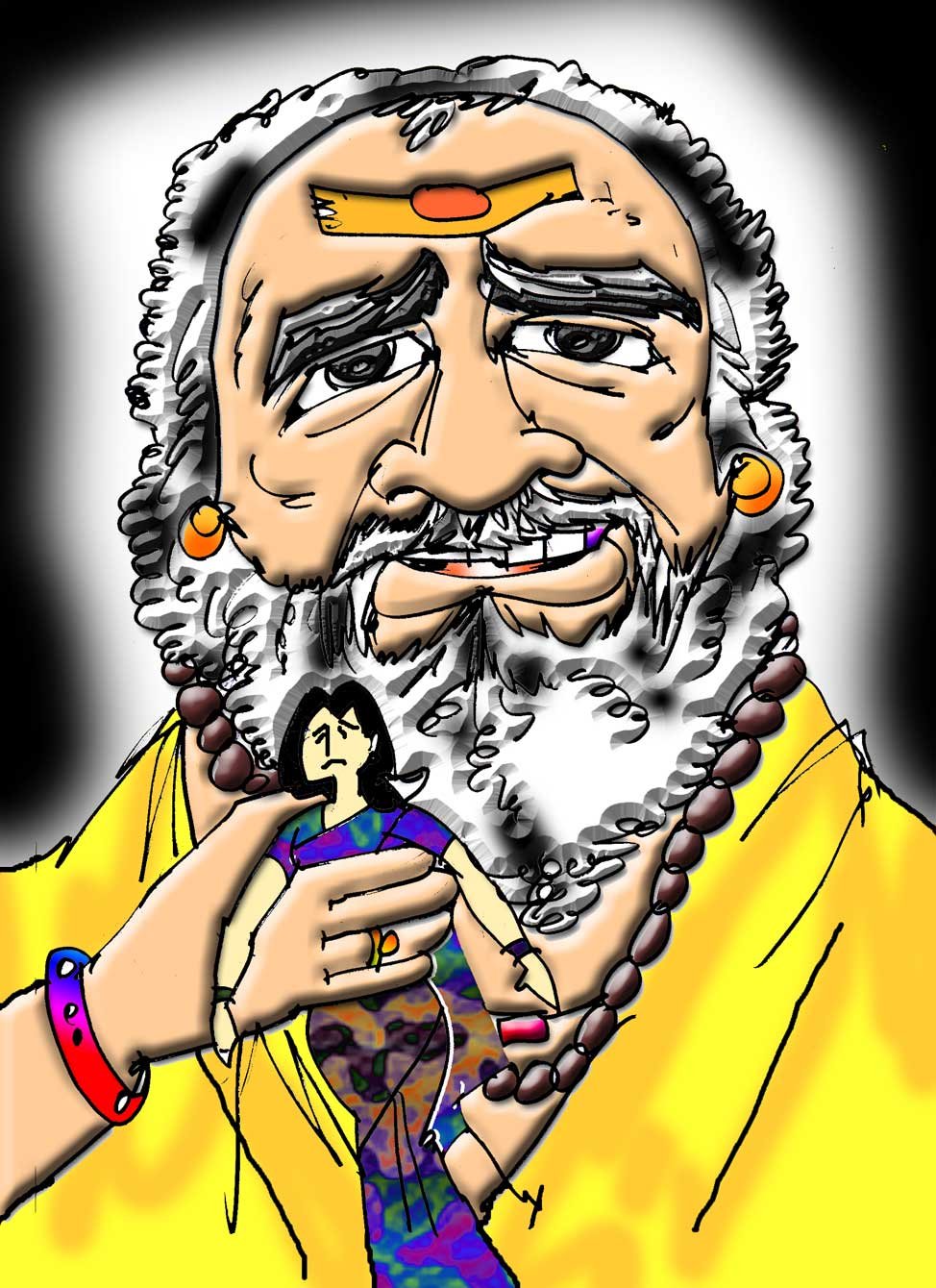 రెండు: సౌందర్యానికి ప్రతిరూపం బాబా. గడ్డాలూ, మీసాలు పెంచుకుని కాషాయం ధరించి, రుద్రాక్షలు వేసుకున్న ఈ శరీరాన్ని చూసి ఏ స్త్రీ వ్యామోహ పడుతుందనుకుంటున్నావా? అతివలు ఆత్మసౌందర్యాన్ని చూస్తార్రా వెర్రివాడా? ‘సిక్స్ప్యాక్’లు వేరు ‘సెక్స్ ప్యాక్’లు వేరు. ‘పత్రి’ వ్రతుడయిన బాబా గురించి మీ పత్రికలు రాశాయి చదవలేదా?!